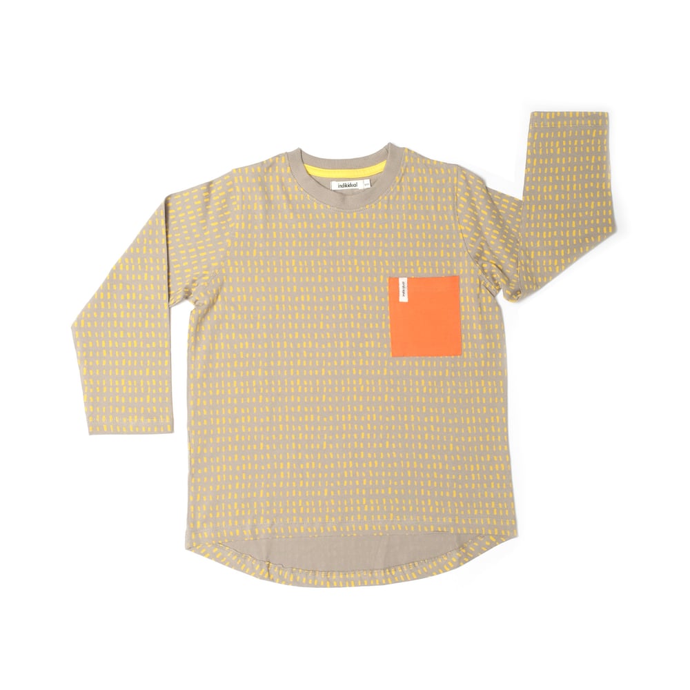 Dash print long sleeve top with dipped back hem and contrast orange pocket