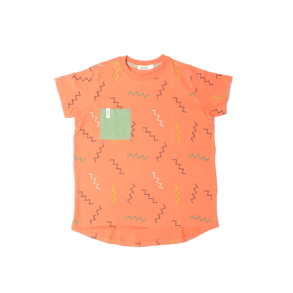 All over zig zag print t-shirt with dipped back hem and sage green pocket.